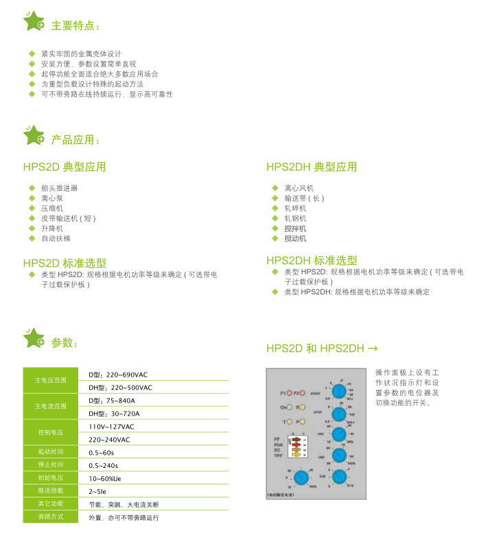 HPS2D75...840HPS2DH30...720 軟起動器均有著堅固的金屬殼體設(shè)計,可分別適用于常規(guī)負(fù)載和重型負(fù)載的各種應(yīng)用場合它結(jié)構(gòu)牢固緊湊,安裝方便快捷。所有參數(shù)和功能選項均通過前面板上的調(diào)節(jié)電位器和功能切換開關(guān)來設(shè)定和選擇。直觀清晰,各工作階段和狀態(tài)及故障均有相應(yīng)LED 指示讓用戶一目了然。特設(shè)節(jié)能功能,當(dāng)電機(jī)運行在空載或輕載時自動降低負(fù)載電壓,